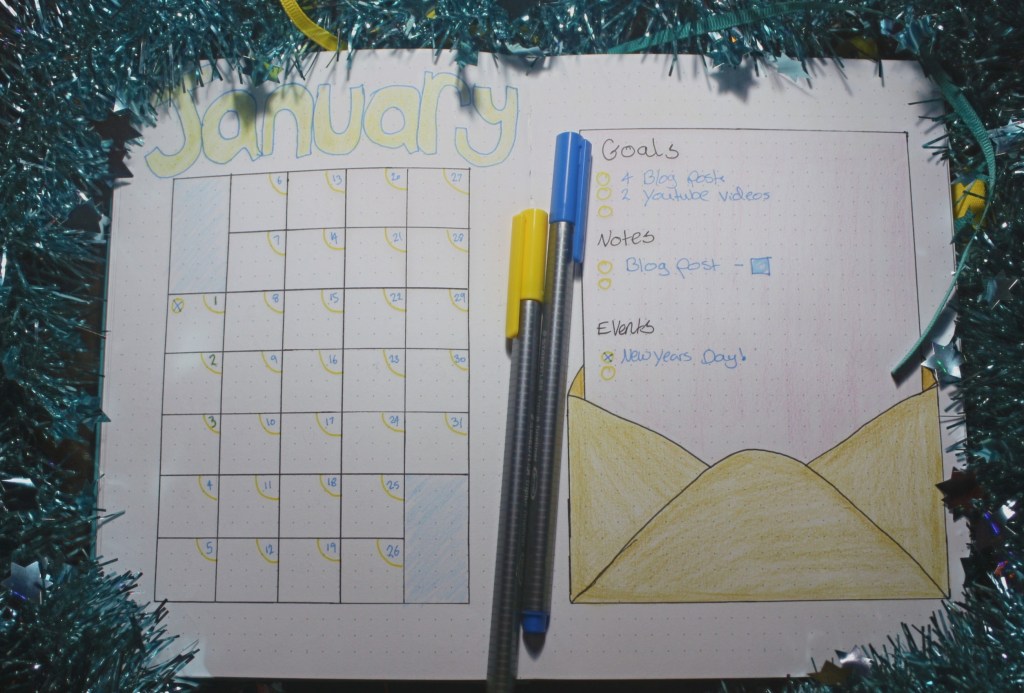 January, the first month of the year! Since I’ve put so much in my yearly spread. I decided to try and keep my monthly one short. Your monthly spread can be different for each month, you could have a page dedicated for something for the month, like the October doodle challenge or a page for new years resolutions in January if you didn’t add that to your yearly spread!