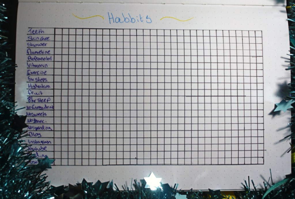 The habit tracker is probably the biggest challenge that I’m really looking forwards to. Theres a lot of different things that I would like to make more of an effort to do everyday, so with this I’ll colour in a square for each day i remember to do each task. hopefully I’ll have filled in at least more than half? ^^;