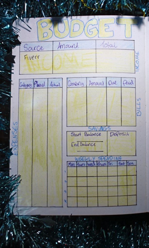 It’s a pretty basic layout. A box for each category: Income, expenses, bills, savings and my weekly spending totals.^^