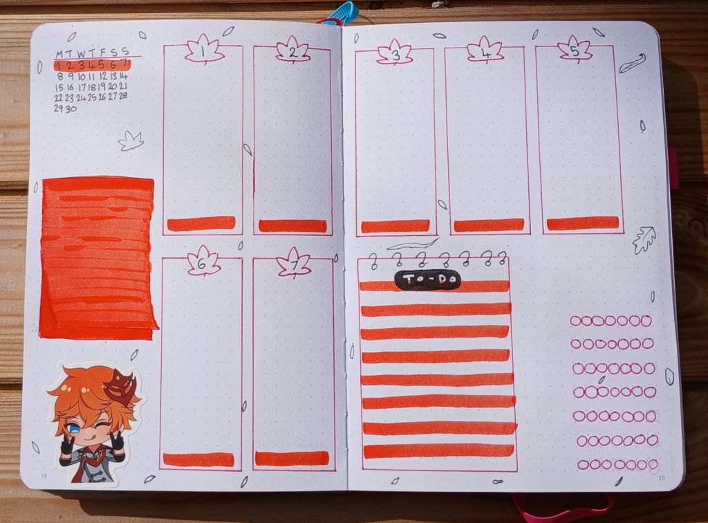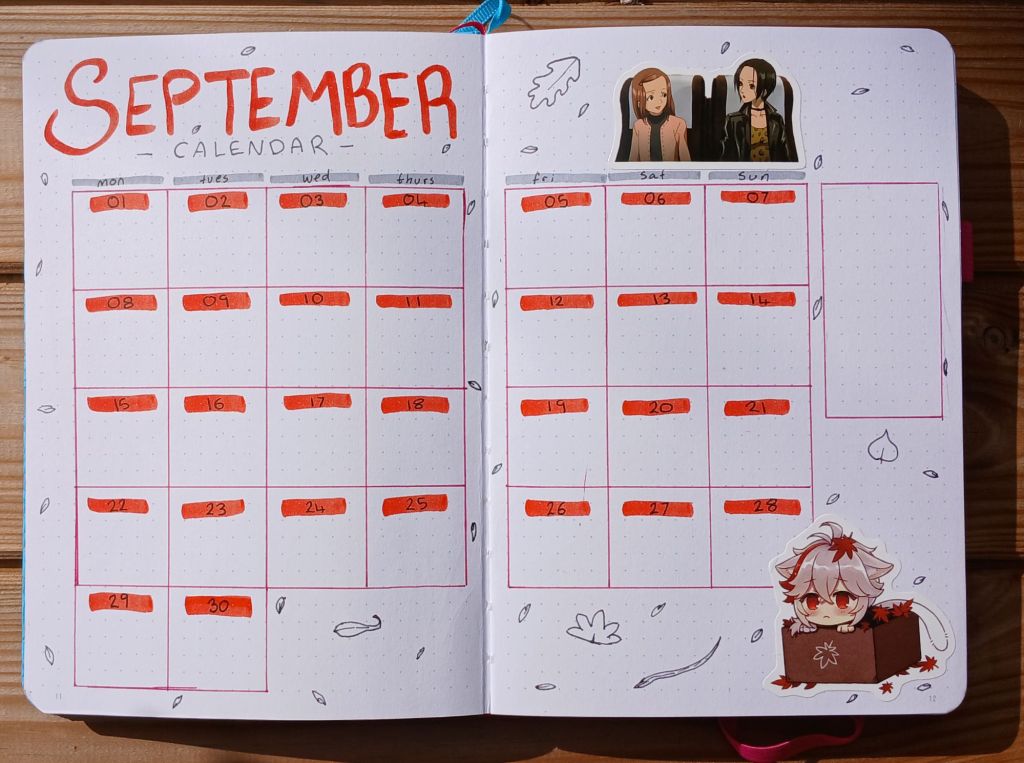 Since October is always reserved for a spooky theme, September gets the fallen leaves. I love the autumn aesthetic. The auburn colours and crunchy leaves that can also be nice and easy to doodle!