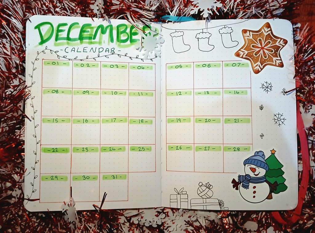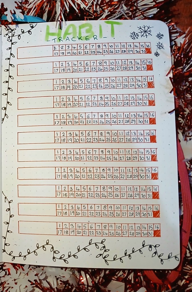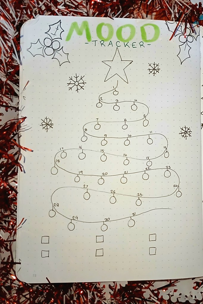 Because of Uni work, I’ve been behind on my Bullet Journal for a few weeks, so I didn’t have as much time to spend on it. I initially wanted to draw a more detailed tree, but then came across a design similar to this on Pinterest that I found inspiring. With the added snowflakes and holly, I think it works quite well!