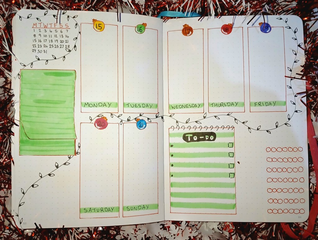 I’m really happy with how this weekly spread turned out, and how the whole month in my Bullet Journal turned out. I received a fine-tipped white paint pen recently, which I got to use for the first time, colouring all these baulbles. Drawing the mini lightbulbs on all of the pages was a bit of a strain on my hand, too, but definitely worth it!
