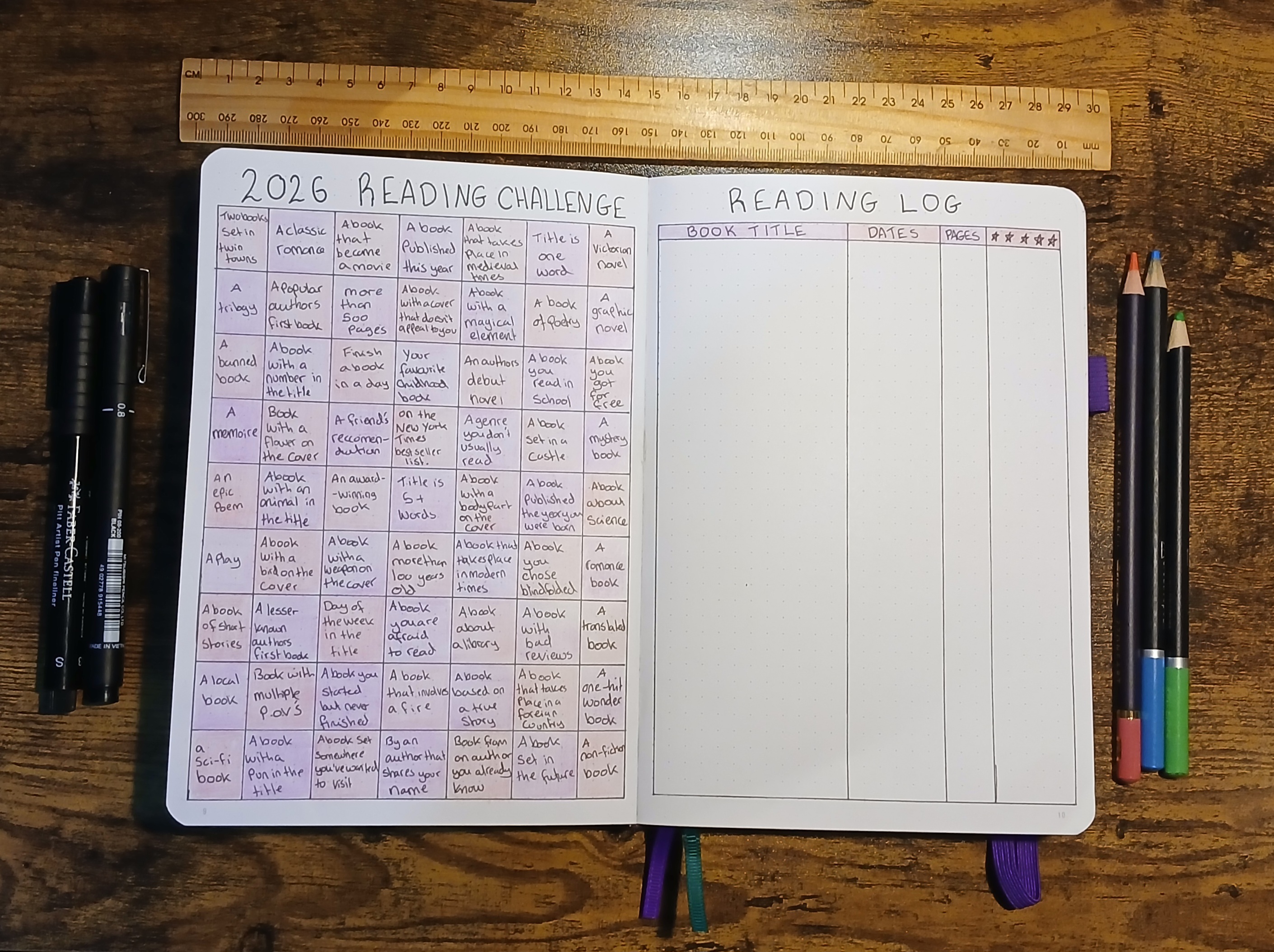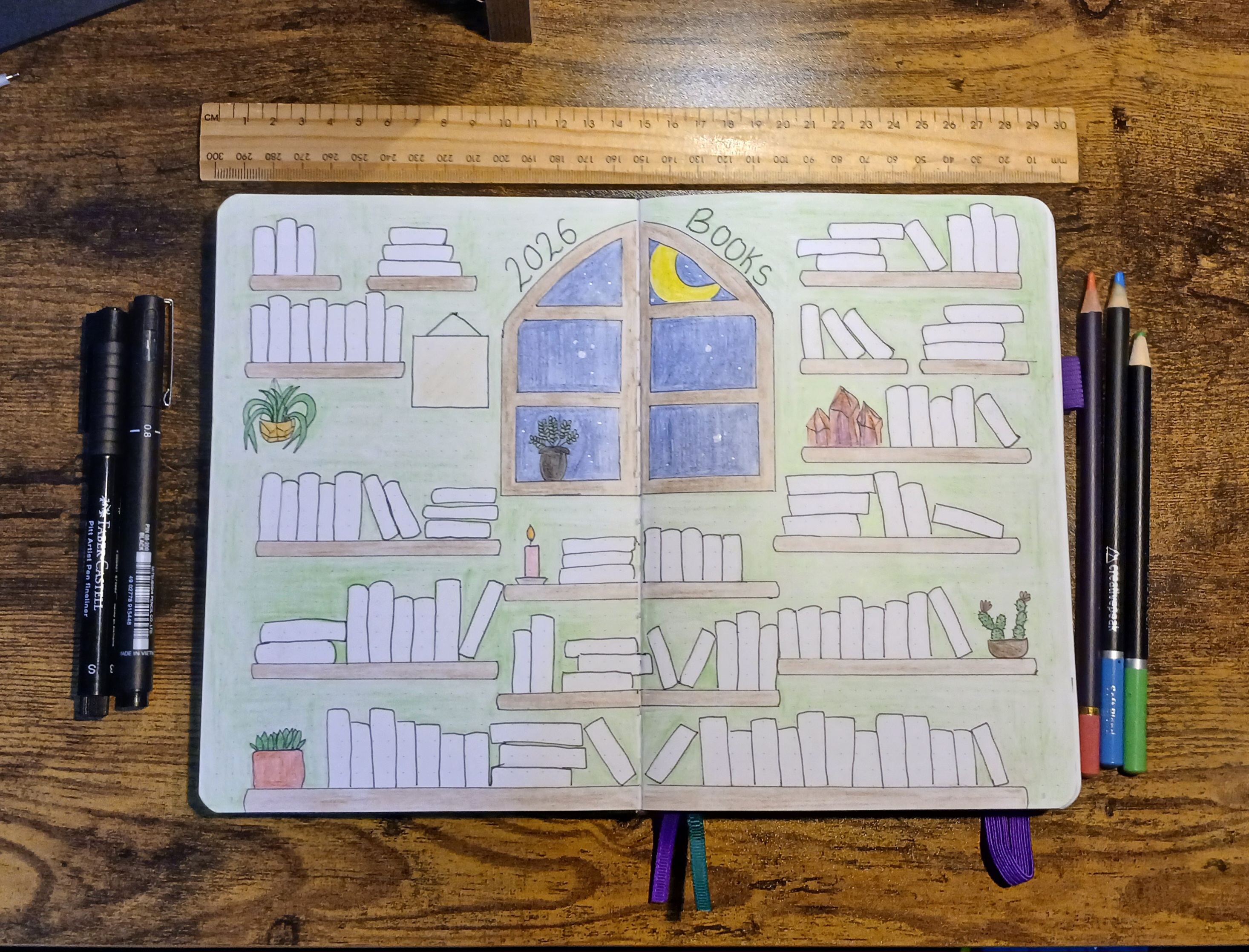 My 2025 reading log and bookshelf were much smaller; the whole thing spanned across two pages. I’d also tried using watercolours and ended up with an uneven background (I still need a lot of practice with watercolour paints!). I wanted some more space to draw out my bookshelf. I also wanted space to log the dates and ratings of the books I read, but I also didn’t want to make the spread uneven… So, I also designed myself a ‘little’ 2026 reading challenge.