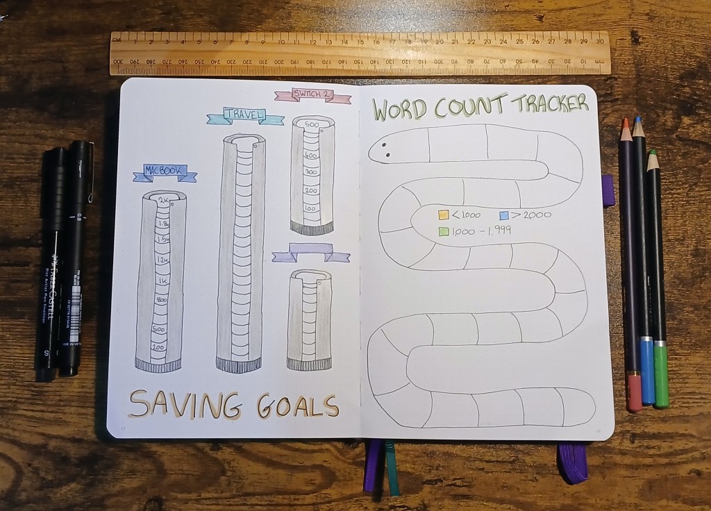 I don’t think I ever ended up labelling any savings goals last year, so I tried to at least pick some for this year. I picked something I need, something I want, and something I should do, and I’ve left a space free in case anything else comes up. I wanted to add some doodles to this page, but was in a bit of a rush to finish it (the end of the year is a chaotic time…). Even so, I do quite like how my little coin holders turned out. (What are these things called again?)