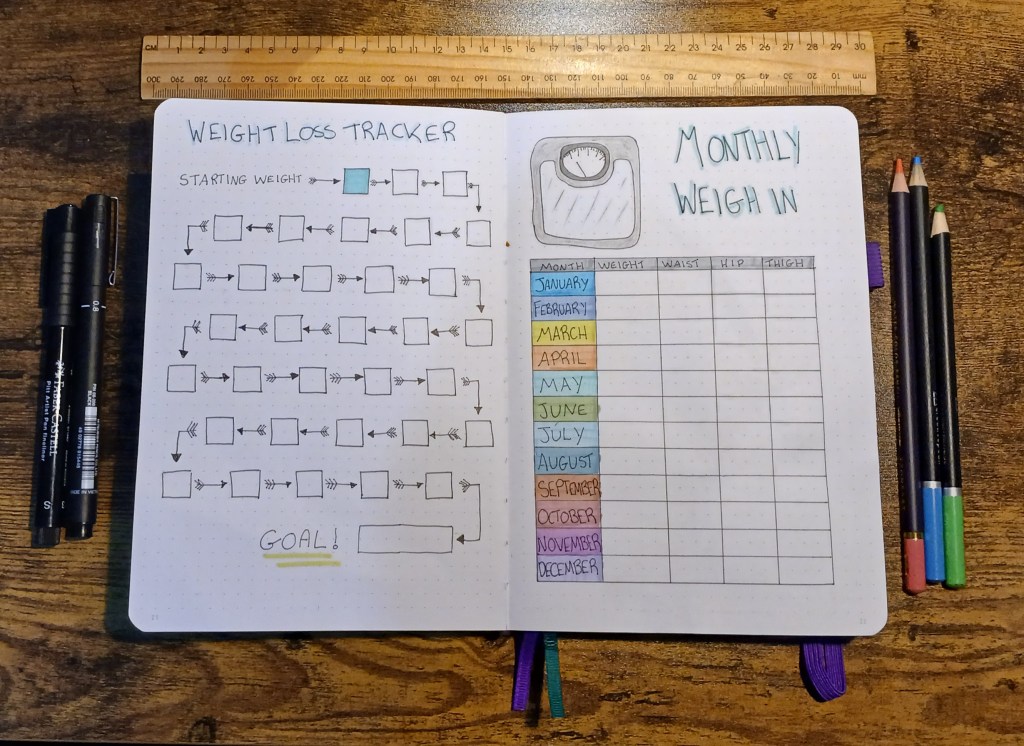 Another page I’ve doubled up – the weight tracker. This year, I’ve added a monthly weigh-in page so I can more clearly track my measurements over the year and hopefully fill in my weight loss tracker to meet my goal alongside it, too!