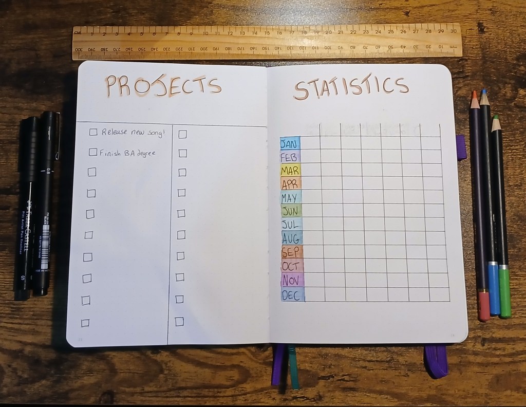 I didn’t finish filling in the row headings for this one, but in order to track my growth (or decline) on my website and other forms of social media, I like to create a page where I can log at least a brief part of the information of statistics. A heading example would be ‘Instagram followers’, which you then write in the amount at the start or end of each month (or the middle if you want…) and can see how it changes over the year. If you run multiple accounts, you can line the stats up side by side and compare what’s more worthwhile! Either way, I often just find it satisfying to fill in, regardless of the totals.